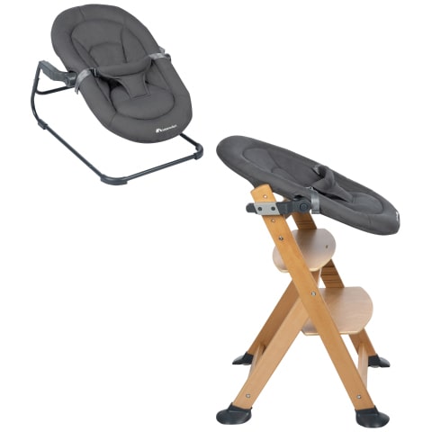 El asiento adaptable de la hamaca 2 en 1 se puede acoplar a la trona Timba para divertirse a la hora de comer con la familia, antes de volver a colocarla en el soporte de la hamaca.